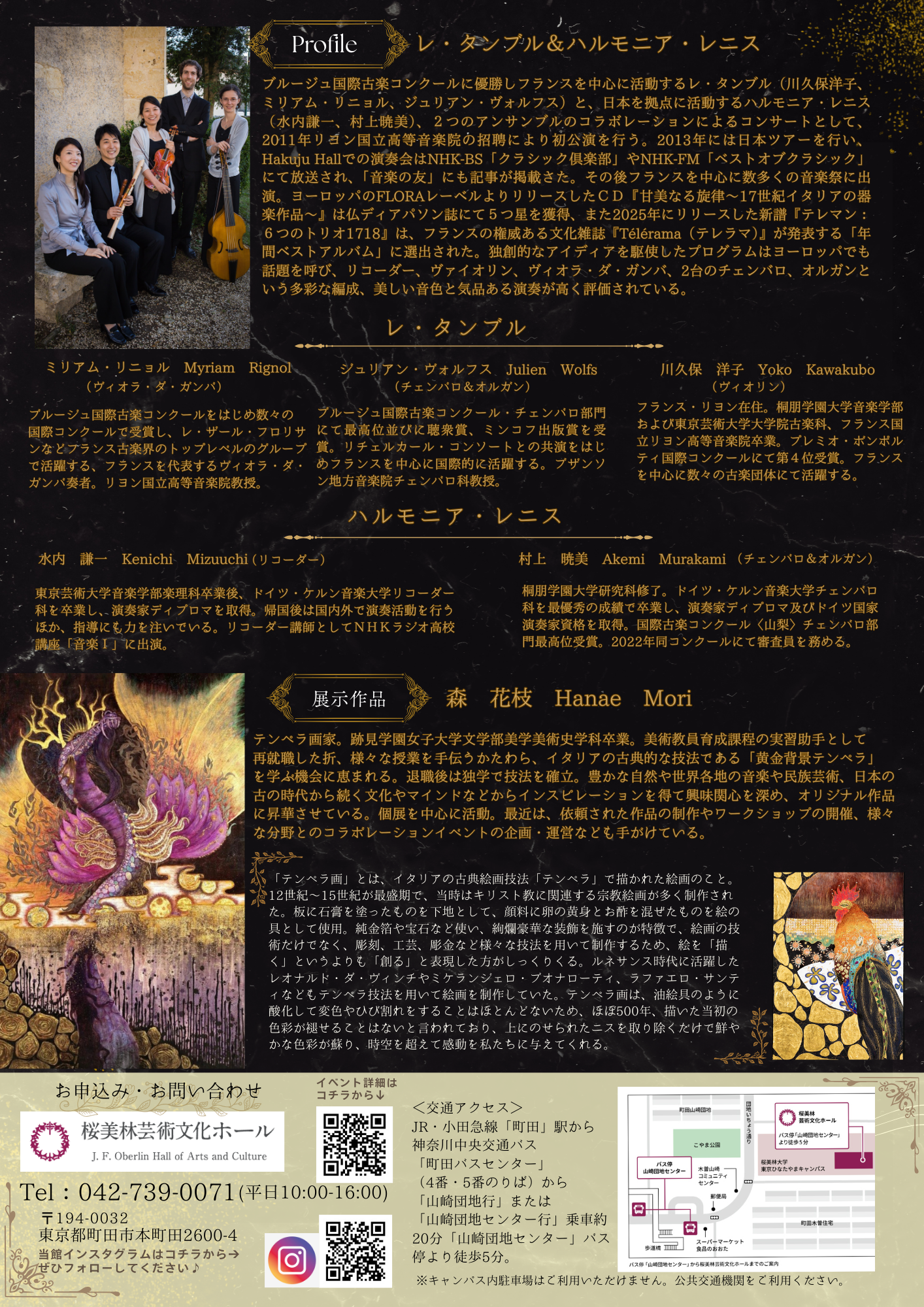 ブルージュ国際古楽コンクールで優勝したフランスを拠点に活躍する「レ・タンブル」と、国内外で数多くの演奏会を行う実力派「ハルモニア・レニス」、日仏2つのグループが融合した古楽アンサンブル。