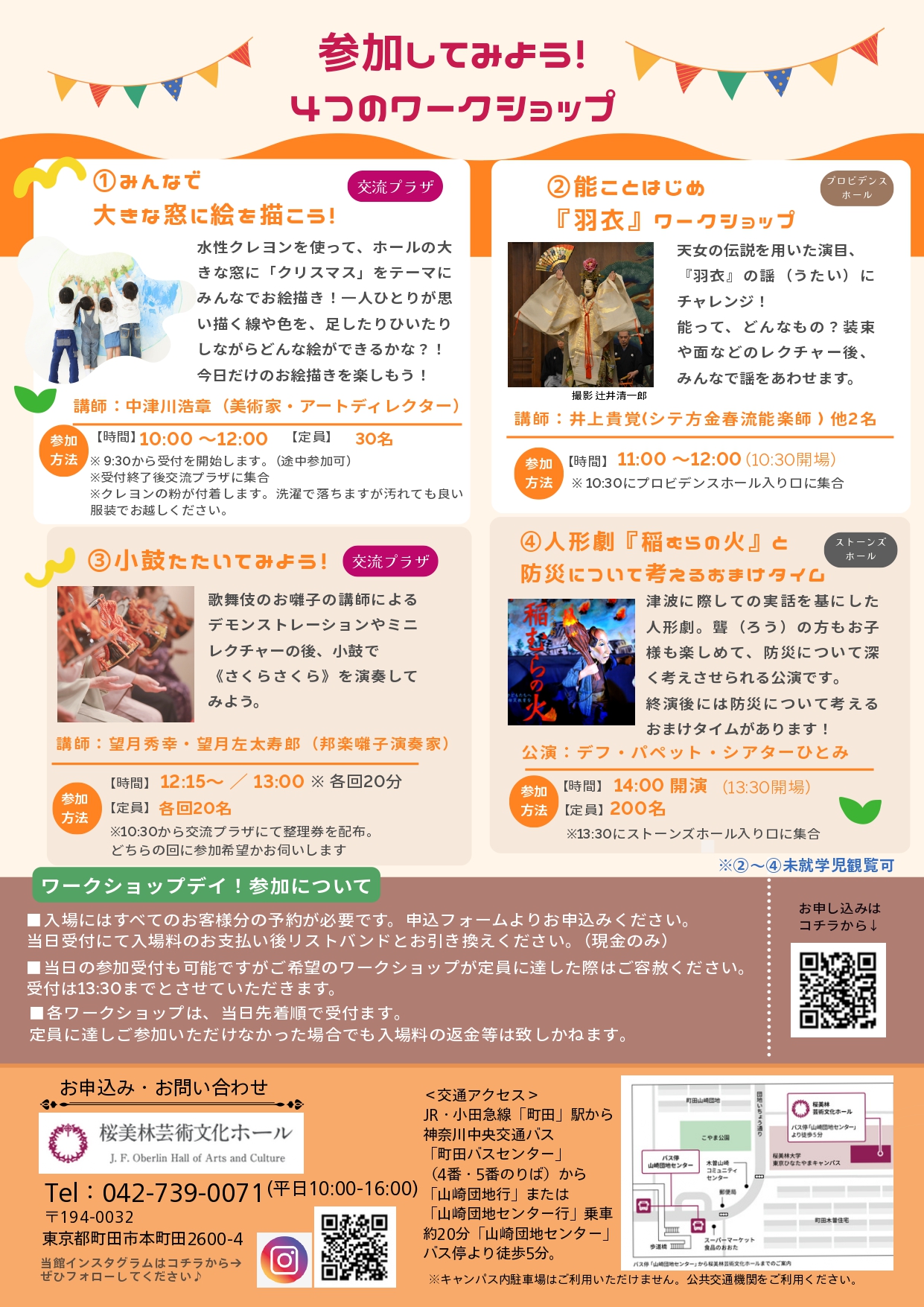 能や小鼓の伝統芸能の貴重な体験、お絵描き、防災について考える人形劇など、親子で楽しめるワークショップデイ!